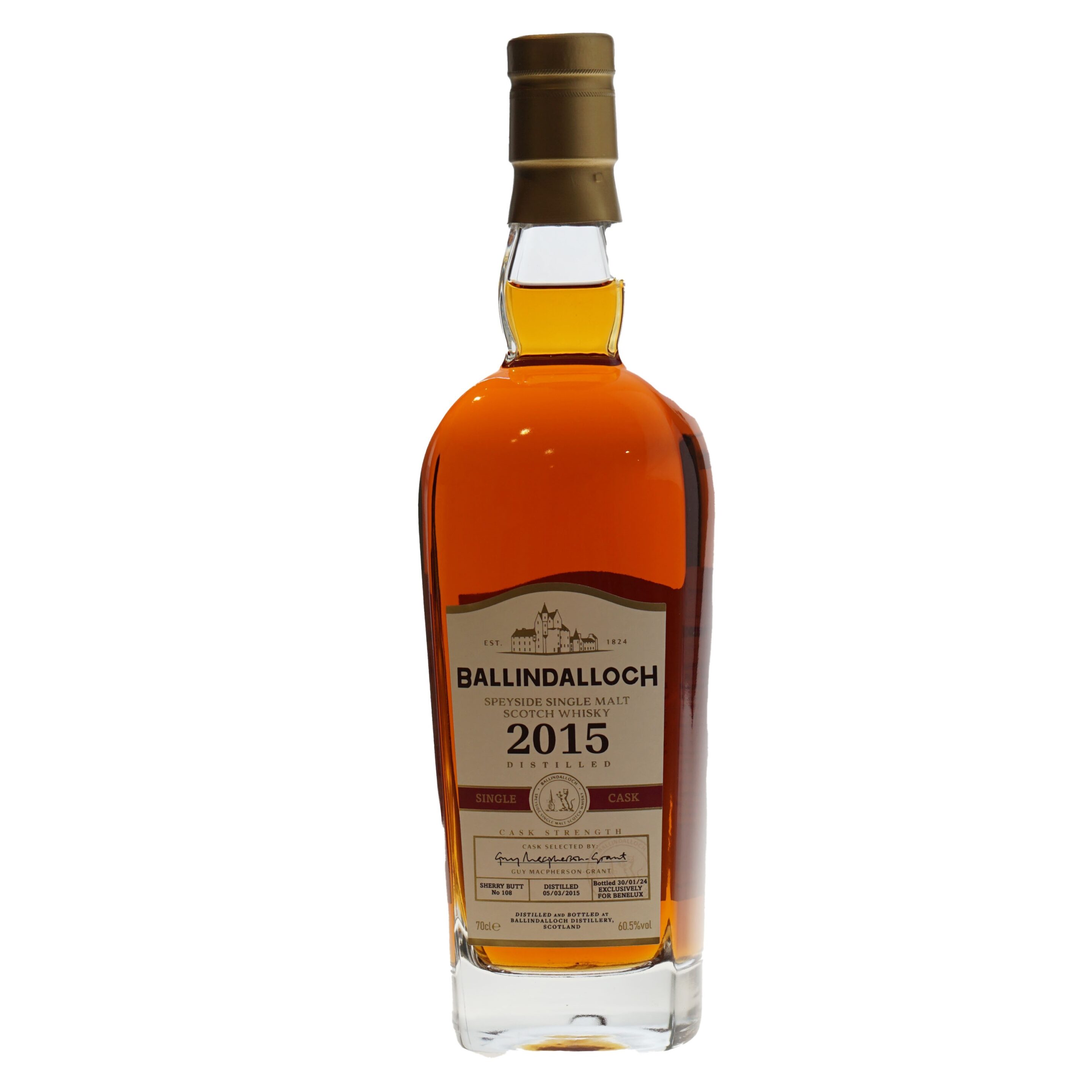 Ballindalloch Whisky Sherry Cask No.108, is special voor de lage landen geselecteerd en gebotteld. Op een Cask Strength van 60,5% heeft dit 631 flessen opgeleverd. Kerrie en Lapsang Souchon vermengen zich met smeulend haardhout, met oud leer,