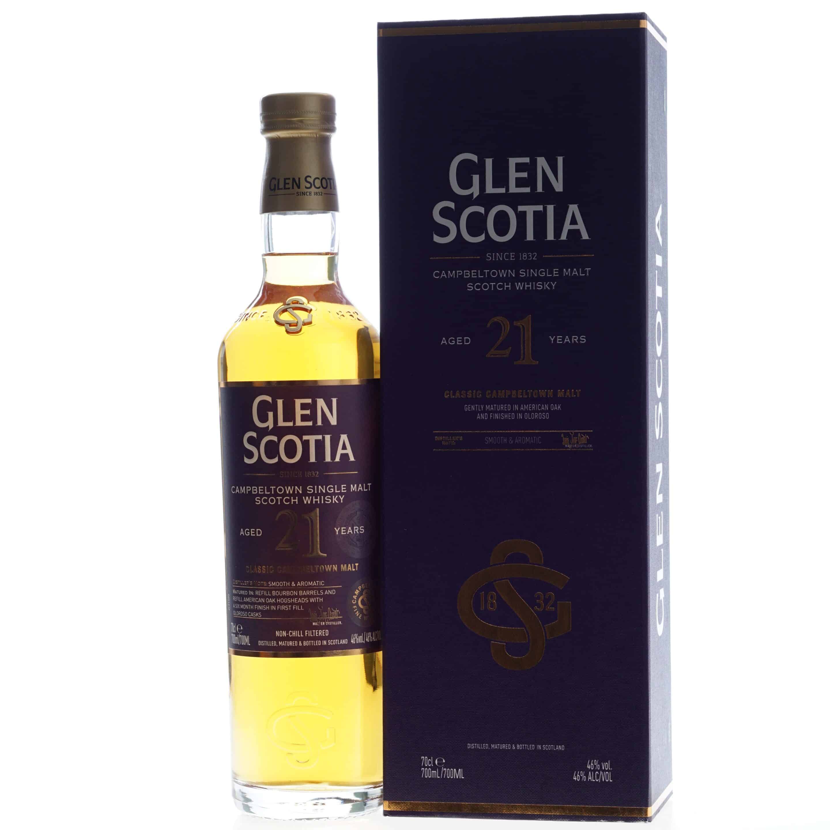Glen Scotia Whisky 21 Years, gelegen op een vaten combinatie van ex-bourbon en Amerikaanse eik. De laatste periode heeft de whisky op een Oloroso sherry vat gelegen gedurende een periode van 6 maanden. Naast tonen van sherry, heeft de whisky hiermee tinten van gedroogd fruit gekregen.