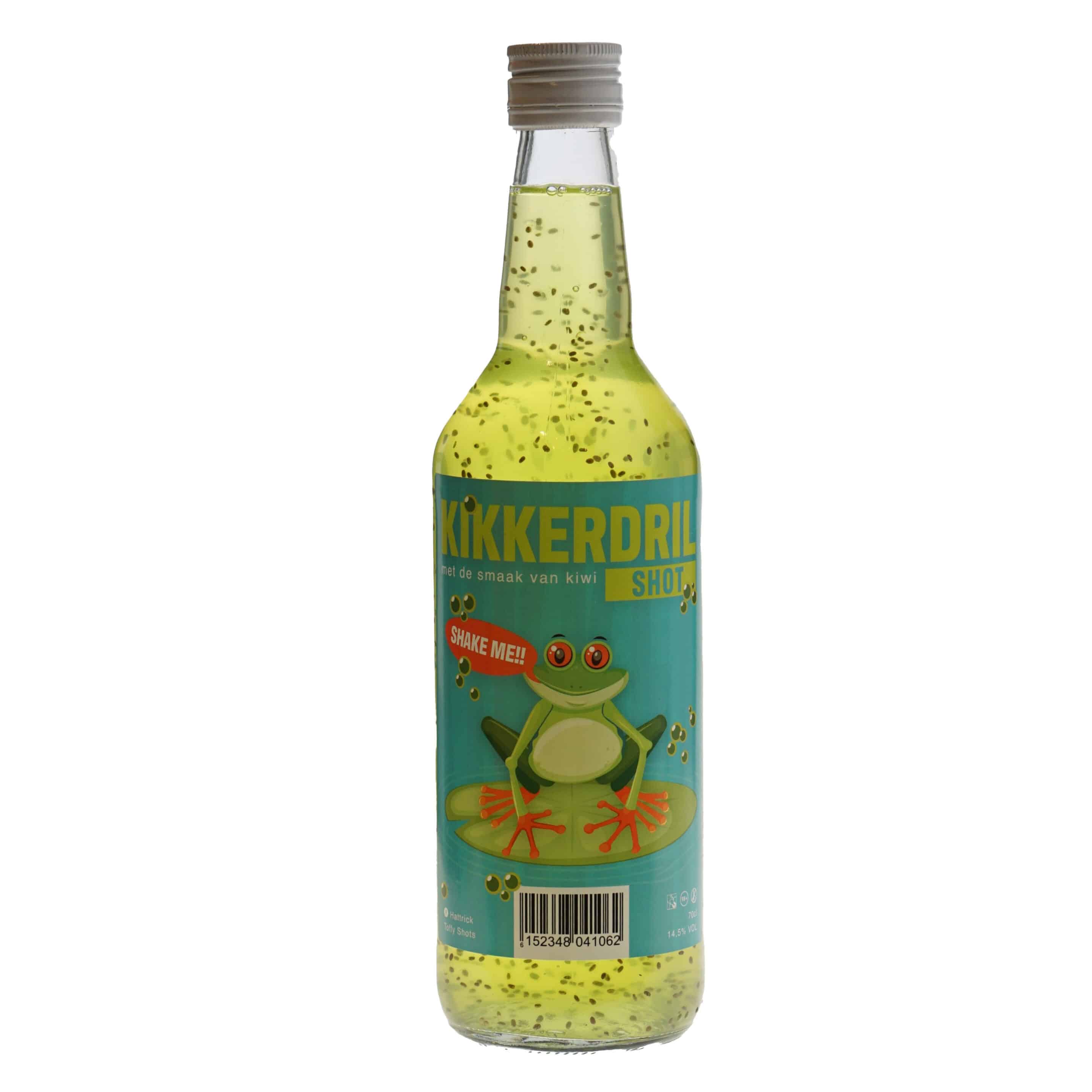 Party Shot Kikkerdril. Een heerlijke kiwi smaak, door de groene kleur, de chia zaadjes en de iets lobbige structuur.