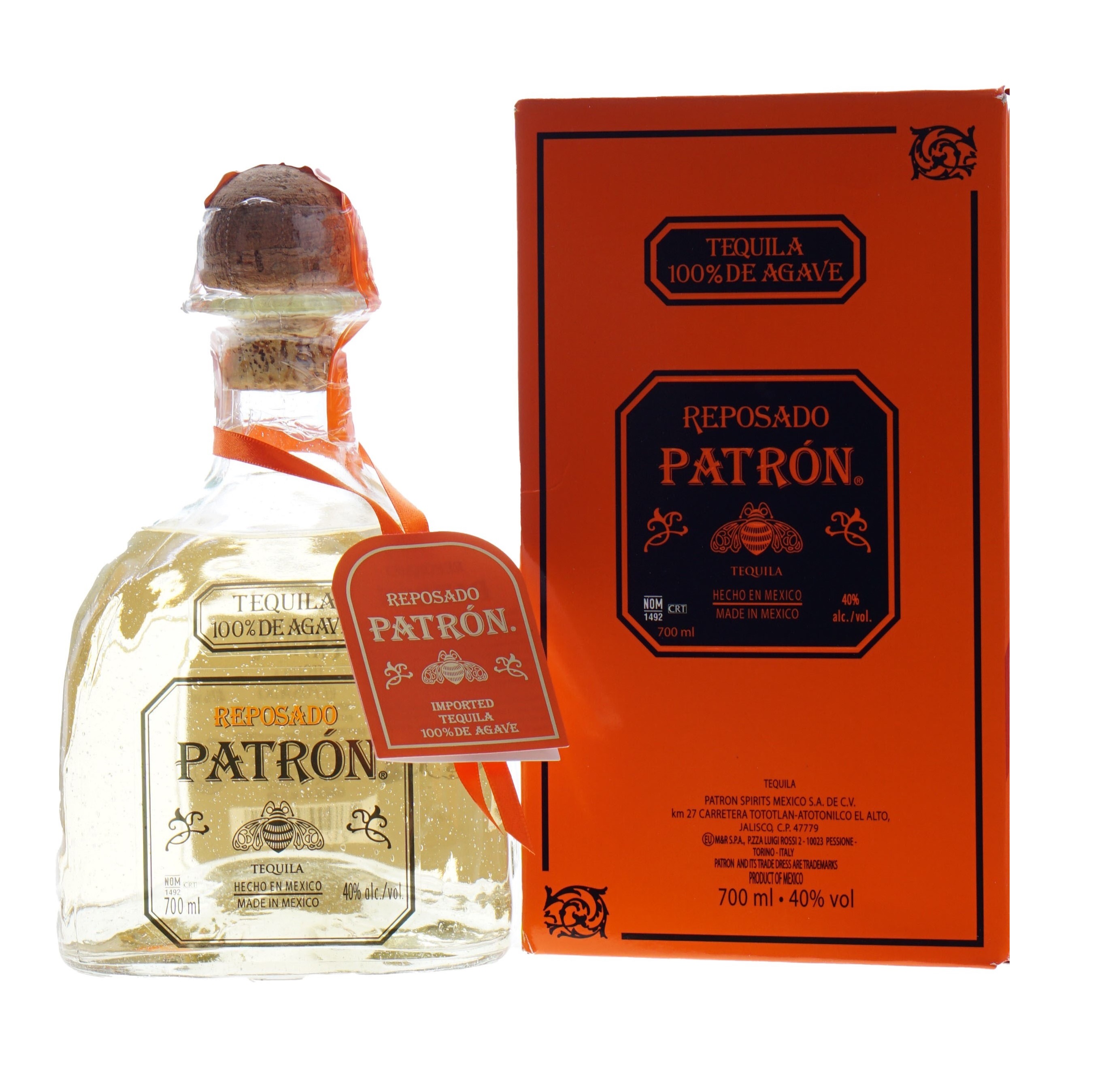 Patron Tequila Reposado, deze premium tequila is met de grootste zorg gemaakt in de hooglanden van Jalisco, Mexico, en biedt een zachte en evenwichtige smaak met tonen van gekookte agave, vanille en eikenhout.