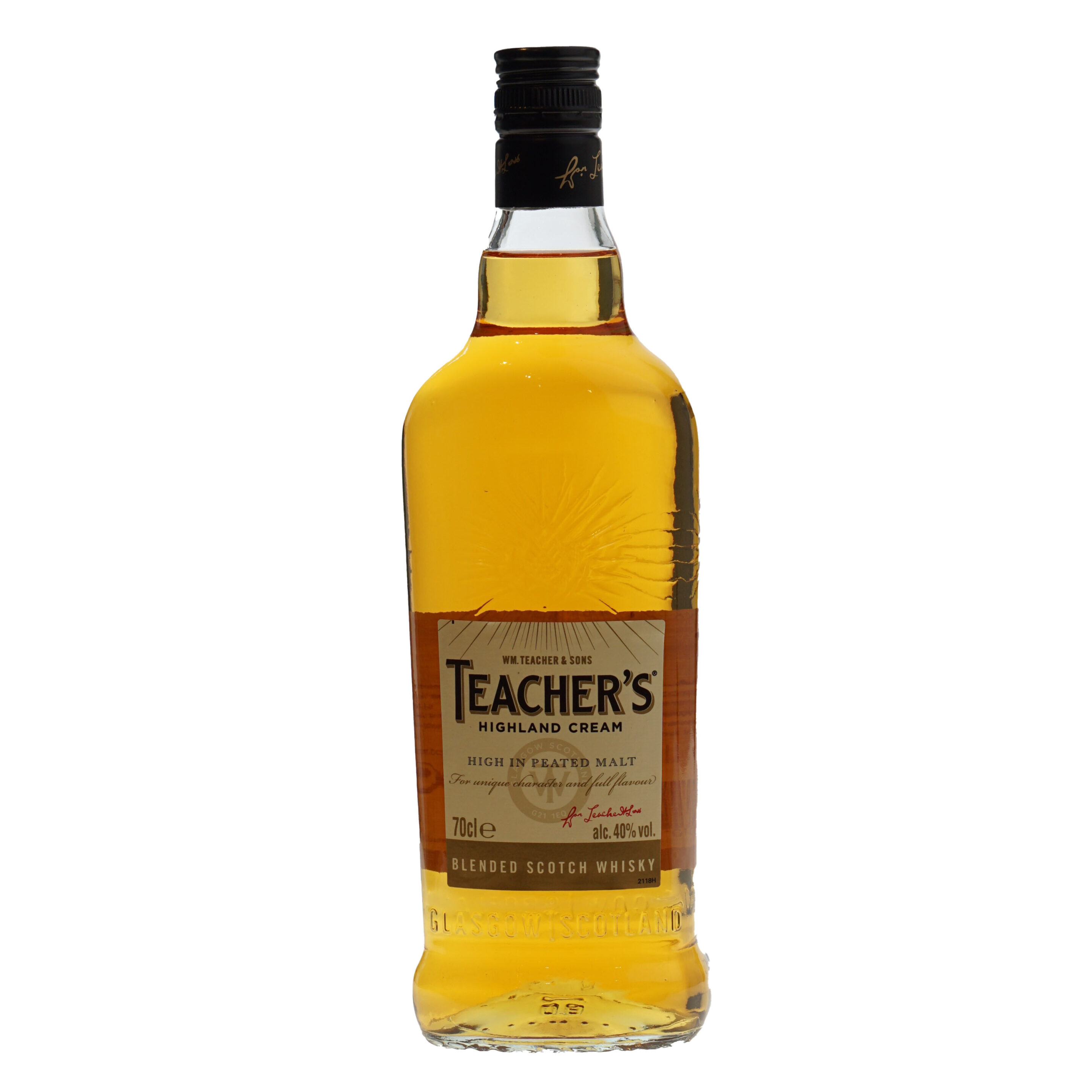 Teacher’s Highland Whisky, opvallend aan deze whisky is het gebruik van de rokerige Ardmore als belangrijkste malt in deze blend. Daarnaast zit er een hoog gehalte aan single malts in (ongeveer 30 verschillende).