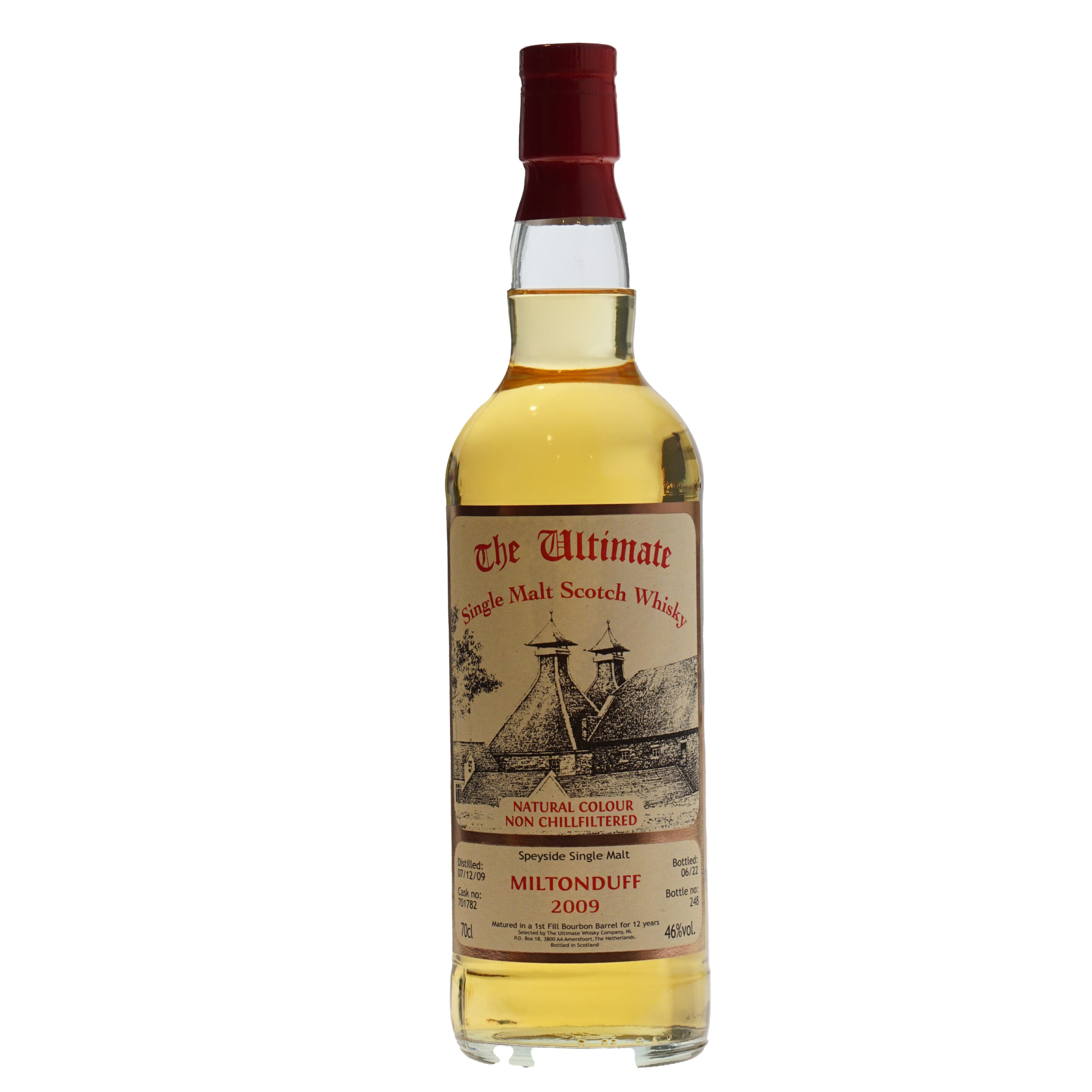 Ultimate Whisky Miltonduff 2009 12 Years. Dist. 07-12-09. Botteld 06-2022 1st. Fill Bourbon Barrel for 12 Years.