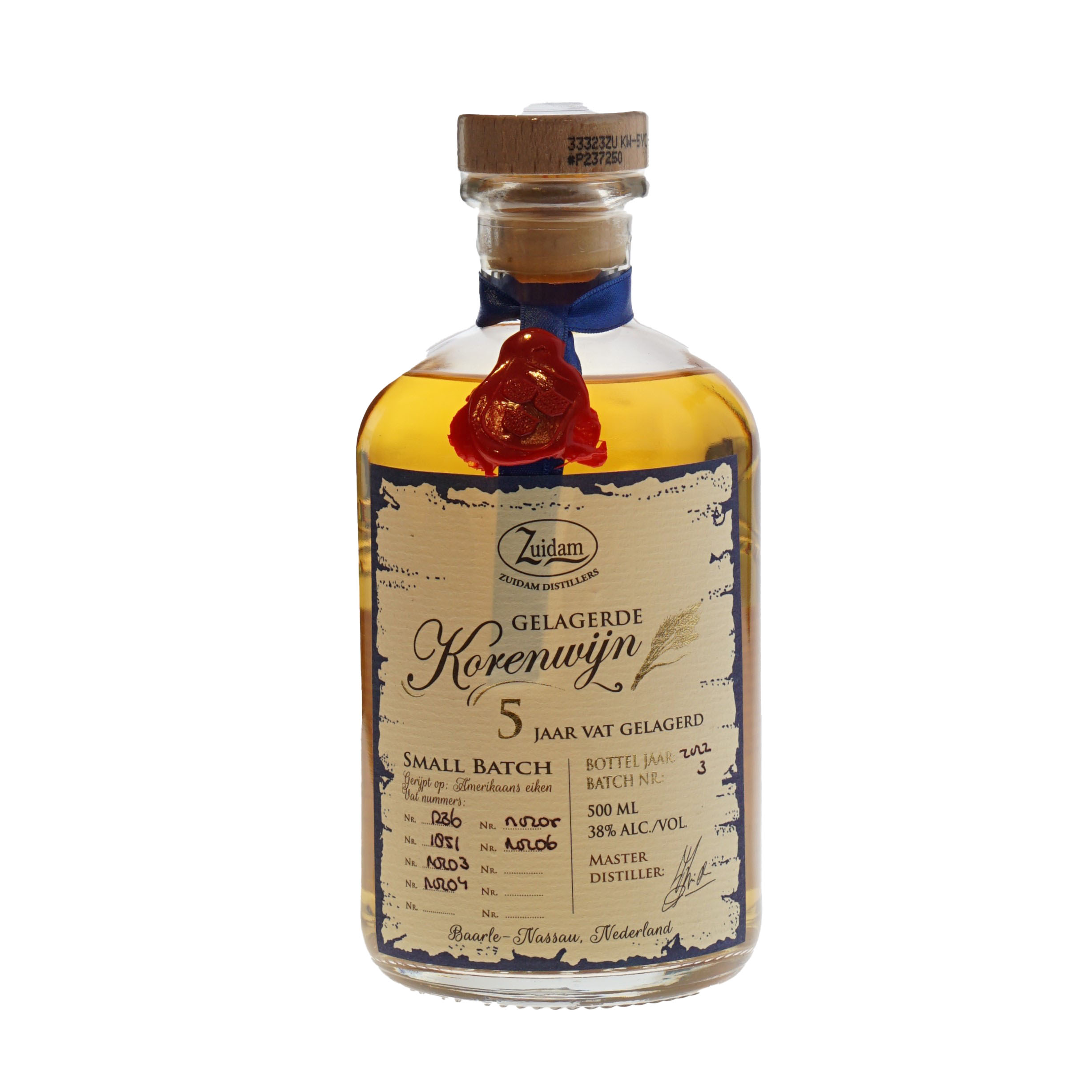 Zuidam Korenwijn is na 5 jaar rijping ongelofelijk rijk en zijdezacht van smaak. Heerlijke tonen van vanille, toffee, karamel en hout. De ruime lager tijd zorgt ervoor dat hij zijdezacht is van smaak. Deze korenwijn laat zich zowel als aperitief als digestief drinken.