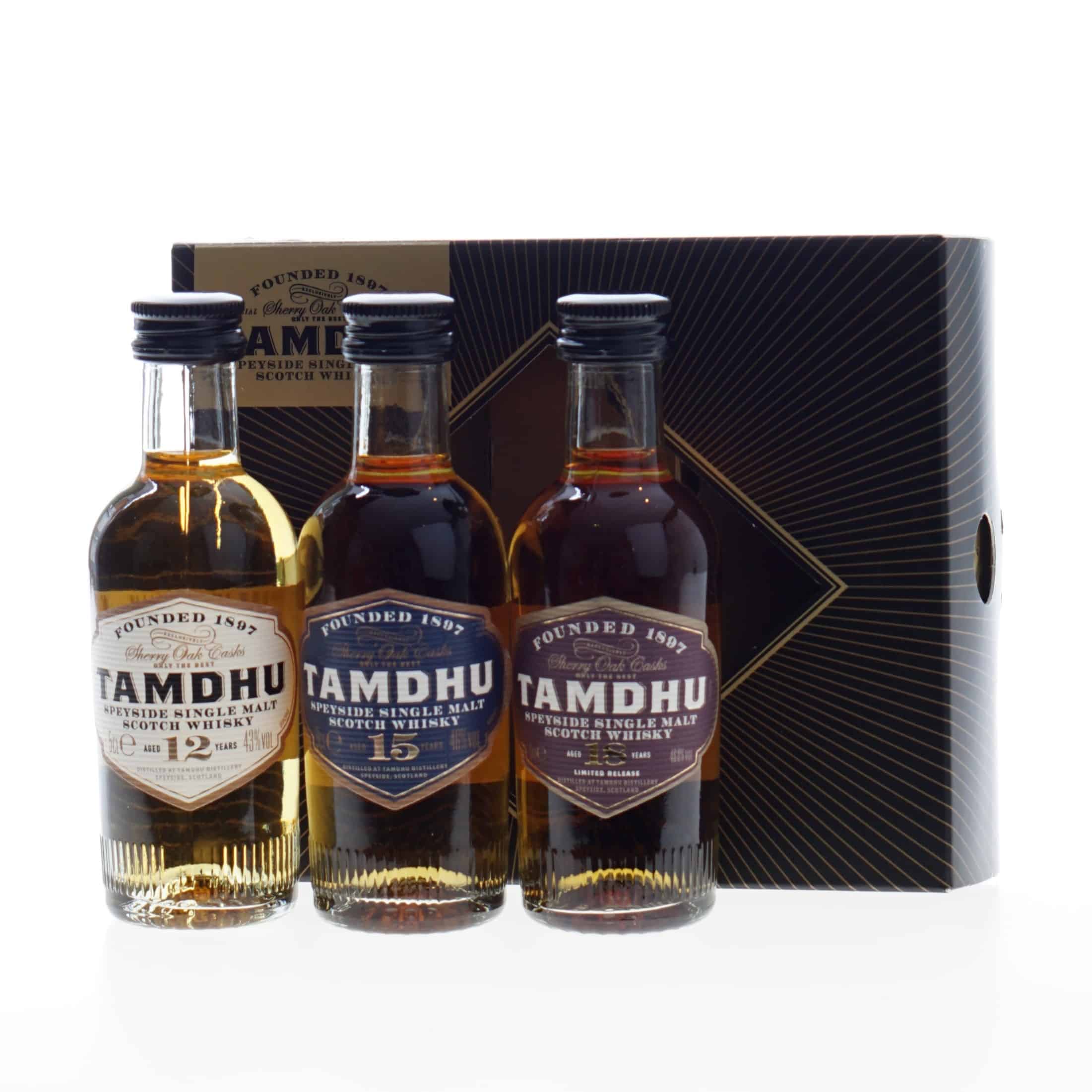 Tamdhu Whisky miniset 3x5cl bevat drie meervoudig gouden bekroonde drams Tamdhu Speyside Single Malt Scotch Whisky de 12 Year Old, 15 Year Old en 18 Year Old, allemaal in miniatuurformaat van 5 cl.